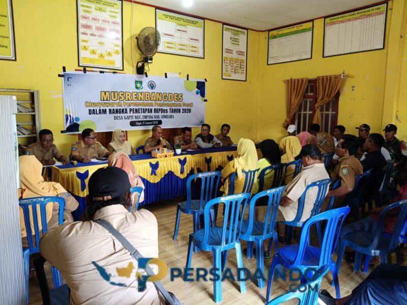 Gapit, Sumbawa — Serda Ikramullah, Babinsa Desa Gapit anggota Koramil 1607-02/Empang, melaksanakan kegiatan rapat Musyawarah Perencanaan Pembangunan Desa (Musrenbangdes) dalam rangka penyusunan dan penetapan Rencana Kerja Pemerintah Desa (RKPDes) Desa Gapit Tahun Anggaran 2026. Kegiatan tersebut berlangsung di Aula Kantor Desa Gapit, Kecamatan Empang, Kabupaten Sumbawa, Senin (12/1/2026).