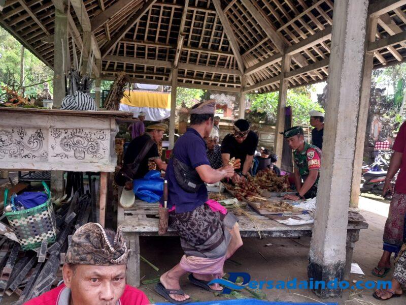Dalam kesempatan tersebut, Babinsa bersama warga tampak bergotong royong mempersiapkan sarana dan perlengkapan upakara adat Piodalan. Suasana kebersamaan terlihat hangat dan penuh semangat, mencerminkan nilai gotong royong yang masih sangat kuat di tengah masyarakat Desa Adat Tegalsaat. Babinsa juga turut memberikan semangat kepada warga agar selalu menjaga kekompakan dan rasa kebersamaan dalam setiap kegiatan adat maupun sosial di lingkungan desa.