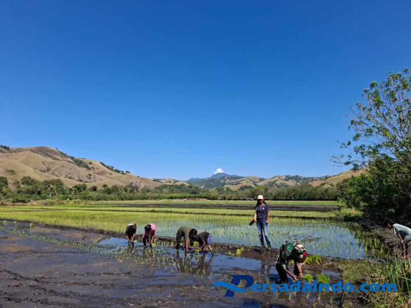 NTT – Ende/Kotabaru, Dalam semangat kemanunggalan TNI dengan rakyat, Bintara Pembina Desa (Babinsa) Koramil 04/Maurole, Sertu Densius Berno, turun langsung ke sawah membantu proses penanaman padi milik Warga Binaanya Bertempat di Desa Tou Barat, Kecamatan Kotabaru, Kabupaten