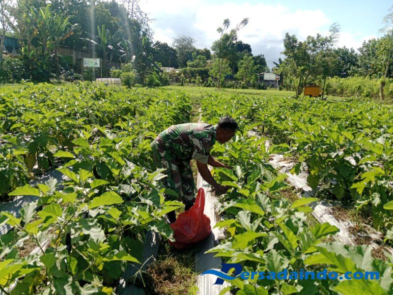 Ende, Babinsa Koramil 1602-01/Ende, Sertu Ana Agung Oka Ardana, melaksanakan kegiatan panen terong di Desa Emburia, Kecamatan Ende, Kabupaten Ende, Flores, Nusa Tenggara Timur, Selasa (5/8/2025).