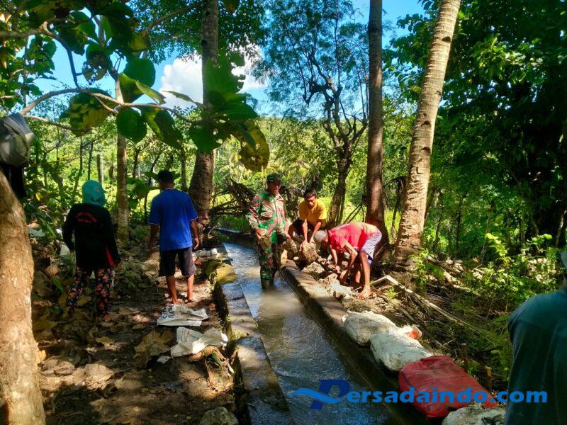 Persadaindo.com NTT Rote Ndao Babinsa Koramil 01/Ba’a Kodim 1627/Rote Ndao, Sertu Markus Anin bersama para Petani melaksanakan kegiatan karya bakti dengan membantu warga memperbaiki saluran irigasi yang rusak, Desa Tuanatuk, Kecamatan Lobalain, Kabupaten Rote Ndao,Selasa (29/4/2025)