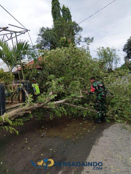 Dengan sigap, Babinsa melakukan evakuasi dan pembersihan pohon tumbang agar arus lalu lintas kembali normal serta mencegah terjadinya kecelakaan bagi masyarakat pengguna jalan.