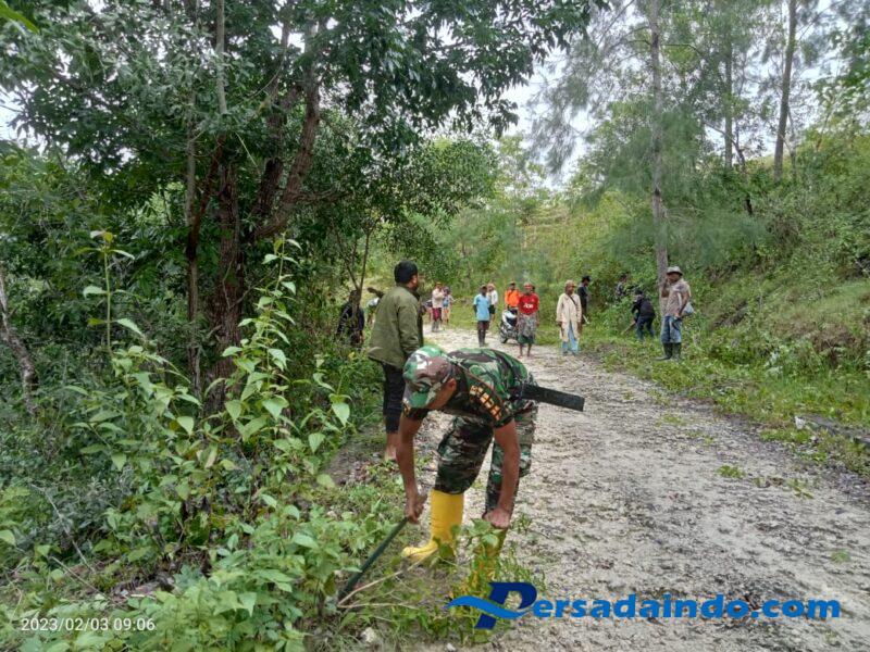TTS _ Bersama Masyarakat Desa Binaan Babinsa Koramil 01/Kota So’e Serda Nyongsri Faot Melaksanakan Gotong Royong Pembersihan Ruas Kanan Kiri Jalan Yang Menghubungkan Desa Tublopo Dan Enoneontes Bertempat Di Dusun A Desa Enoneontes Kabupaten TTS Kamis (8/05/2025).