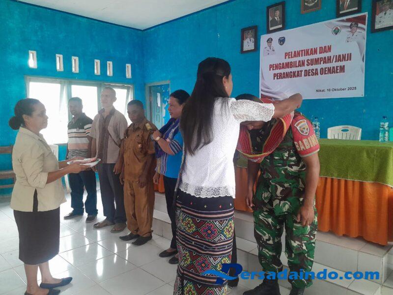 NTT-Kefamenanu, Jumat 10 Oktober 2025, Bintara Pembina Desa (Babinsa) Koramil 1618-04/Bisel, Serda Siprianus Ngasi, menghadiri kegiatan pelantikan perangkat Desa terpilih di Desa Oenaem, Kecamatan Bikomi Selatan, Kabupaten Timor Tengah Utara (TTU), yang berlangsung dengan khidmat dan lancar.