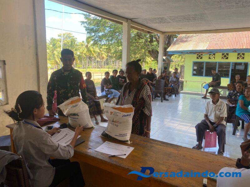 NTT-SIKKA Babinsa dari Koramil 1603-04/Kewapante, Pratu Yongki Alexander Tnunai berperan dalam proses distribusi beras dari BULOG kepada 102 KK di desa waiara, kecamatan Kewapante, Kabupaten Sikka pada hari Minggu (20/07/2025).