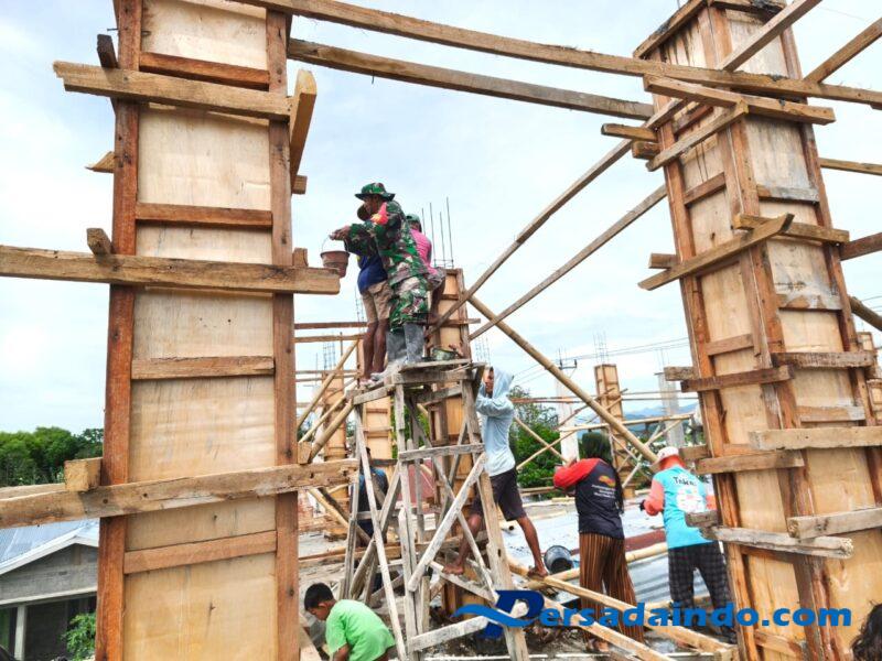 Kegiatan gotong royong pengecoran tiang Masjid Al-Ikhwan di Desa Risa yang menjadi bukti nyata kehangatan dan kekompakan masyarakat bersama Babinsa dalam membangun desa yang lebih baik.