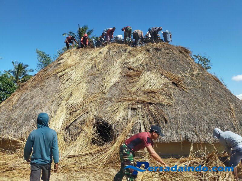 Belu – Pos Laktutus bantu masyarakat membongkar rumah adat suku Akas bersama warga Adat Dusun Horak, Desa Fatuleno, Kecamatan Nanaet, Kabupaten Belu. Minggu (27/07/2025).