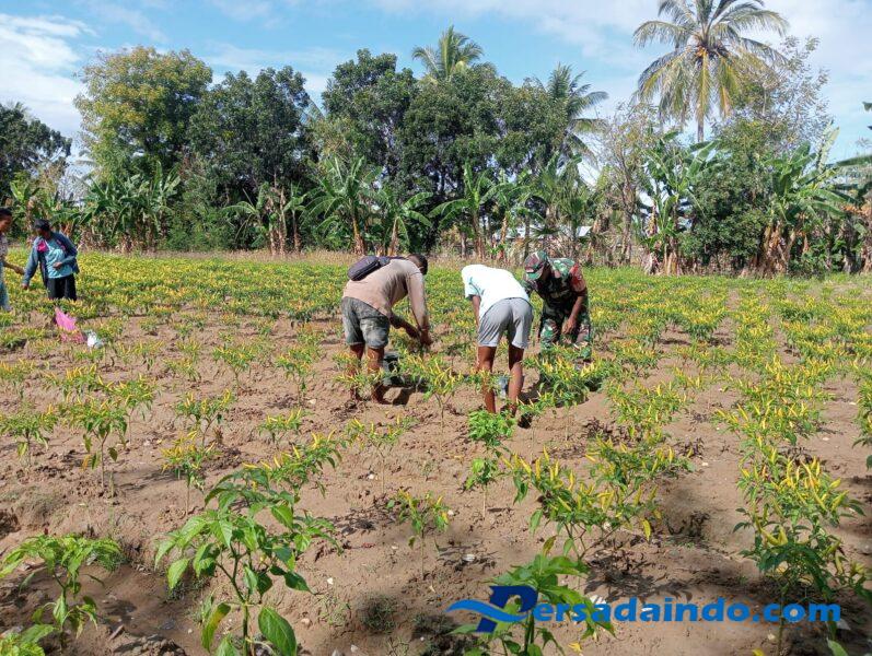 KODIM 1605/BELU, Babinsa Desa Litamali Koramil 1605-05/Kobalima Sertu Maximus Nahak membantu kelompok tani Bambu Kuning melaksanakan kegiatan panen cabai di Dusun Sukabisikun, Desa Litamali, Kecamatan Kobalima, Kabupaten Malaka, Senin (8/9/2025).
