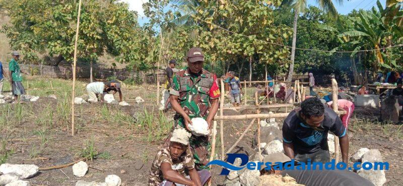 NTT_ALOR, – Babinsa Koramil 02/Pantar Kodim 1622/Alor Sertu Lodewik Kay laksanakan gotong royong bersama warga dalam membantu pembuatan fondasi rumah milik Bapak Robinson Ladang, yang bertempat di Desa Ombay Kec. Pantar Timur, Kab. Alor, Rabu (28/06/2025).
