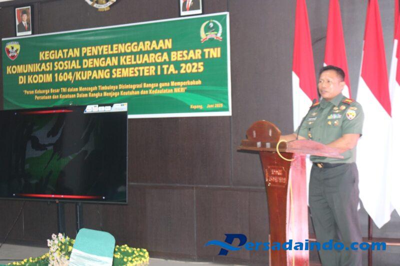 NTT-KUPANG, – Kodim 1604/Kupang menggelar kegiatan Komunikasi Sosial (Komsos) dengan Keluarga Besar TNI (KBT) Semester I Tahun 2025 yang berlangsung di Aula Makodim 1604/Kupang. Acara ini dihadiri oleh Kasdim 1604/Kupang Letkol Czi Sunardi, S.T., M.I.P, para perwira staf, Danramil jajaran Kodim 1604/Kupang serta perwakilan KBT sebanyak 80 orang. Hadir pula Ketua LVRI Macab Kab. Kupang Peltu Purn. Paulus Bere, Ketua PC HIPAKAD Kota Kupang Bpk. Antonius Rindjani Watu Raka, perwakilan Ketua KB FKPPI Ibu Idje Odja, dan perwakilan Persit KCK Cab. XV Kodim 1604/Kupang Ny. Lalu Fajar. Rabu (18/06/2025).