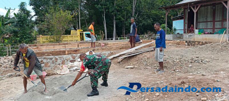 Dalam kegiatan tersebut, Sertu Jonisius Alfridus Nahak terlihat turun langsung ke lapangan membantu Bapak Yakobus Akan, warga RT 05/RW 03, yang sedang membangun fondasi rumahnya. Ia bersama warga bahu-membahu mengaduk campuran semen sebagai bagian dari proses pembangunan.