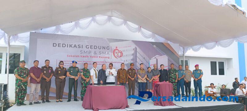 NTT-KUPANG, — Babinsa Kelurahan Oebobo Koramil 1604-01/Kota, Peltu Agus SR, mewakili Danramil 1604-01/Kupang menghadiri acara dedikasi gedung baru SMP dan SMA Kasih Yobel Kupang. Acara yang berlangsung di Jalan Polisi Militer, RT 011 RW 004, Kelurahan Oebobo, Kecamatan Oebobo, Kota Kupang ini merupakan momen bersejarah bagi Yayasan Gema Kasih Yobel dalam memperkuat komitmennya di bidang pendidikan. Rabu (04/06/2025).