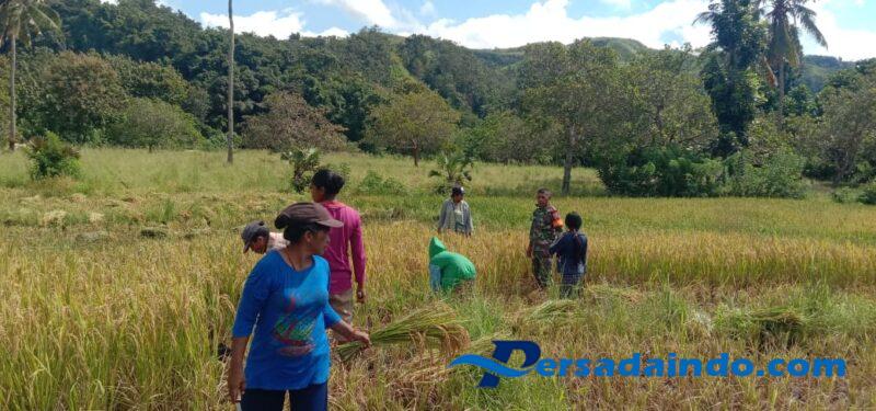 NTT-Sumba Timur, Dalam upaya mendukung program ketahanan pangan nasional, Bintara Pembina Desa (Babinsa) Koramil 04/Tabundung, Koramil Kopka Y. Yupiter B, melaksanakan pendampingan langsung kepada masyarakat dalam kegiatan panen padi sawah di Desa Persiapan Prekomba, Kecamatan Tabundung, Kabupaten Sumba Timur.pada hari Jumat (04/07/2025).