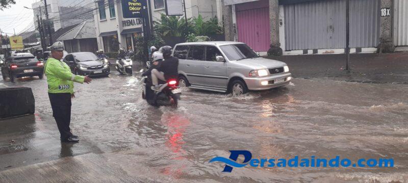 Paska hujan deras ada dua titik menjadi perhatian Anggota Unit Lantas Polsek Kuta Utara mengurai arus lalin akibat genangan air di jalan yakni jalan raya Kerobokan selatan simpang Semer dan simpang Berawa jalan raya Canggu