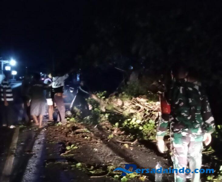 Dengan menggunakan alat seadanya dan penerangan terbatas, mereka bersama warga bahu membahu memotong dan membersihkan dahan serta batang pohon yang melintang di jalan. Upaya ini dilakukan untuk memastikan jalur vital tersebut bisa segera dilalui kembali oleh kendaraan.