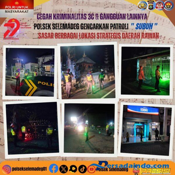 Polres Tabanan– Polsek Selemadeg meningkatkan intensitas patroli subuh untuk mencegah kejahatan 3C (Curas, Curat, Curanmor) di wilayah hukumnya. Patroli “Blue Light” ini difokuskan pada jam-jam rawan subuh, saat potensi tindak kriminalitas cenderung meningkat. Kamis 03/07/2025, Pkl. 03:04 Wita s/d 04:27 Wita.