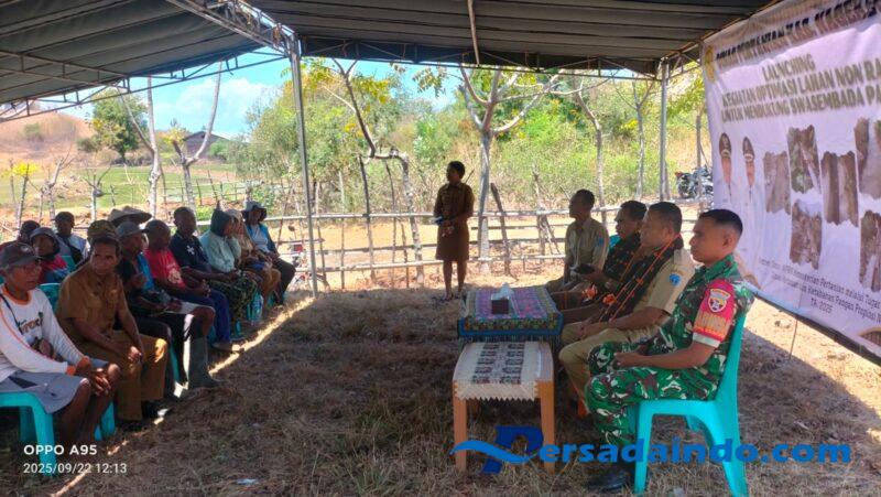 Nagekeo – Babinsa Koramil 1625-05/Aesesa, Praka Simon Soares, menghadiri kegiatan Launching Optimasi Lahan Non Rawa untuk Mendukung Swasembada Pangan sekaligus peletakan batu pertama pondasi irigasi di Desa Waekokak, Kecamatan Aesesa, Kabupaten Nagekeo, pada Senin (22/09/2025) pukul 11.00 WITA.
