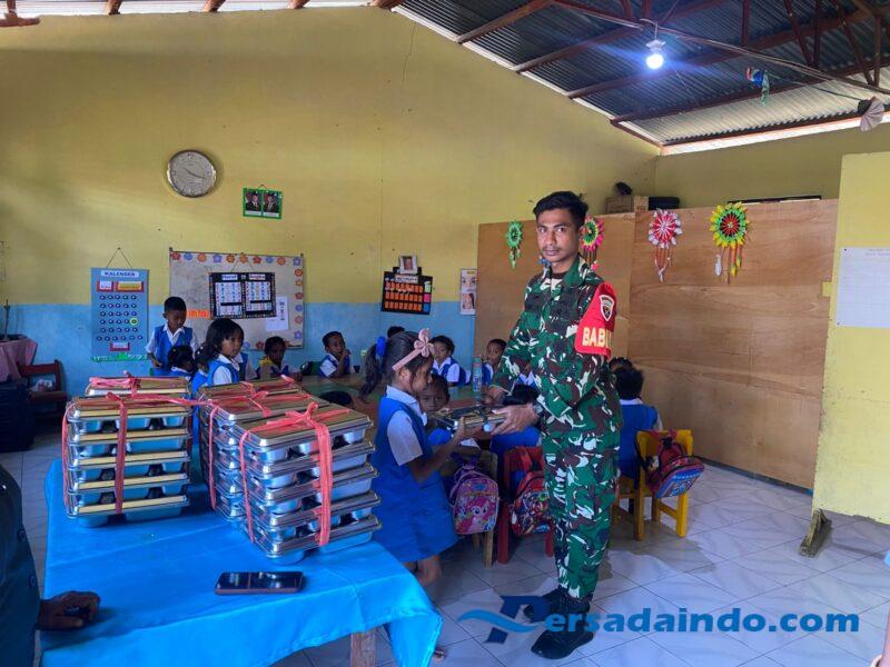NTT-SIKKA. Babinsa Koramil 1603-04/Kewapante, Pratu Yongki Alexander Tnunai, melaksanakan monitoring kegiatan pembagian makanan bergizi yang didistribusikan oleh Dapur Yaspen Waiara di TKK St. Andreas, Desa Waiara, Kecamatan Kewapante, Sabtu (04/10/2025).