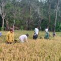 SATGASTER KODIM 1605/BELU, Anggota Satgaster Kodim 1605/Belu Pos Fatubesi Bawah Sertu Servasius Manek membantu petani memanen padi di lahan sawa...