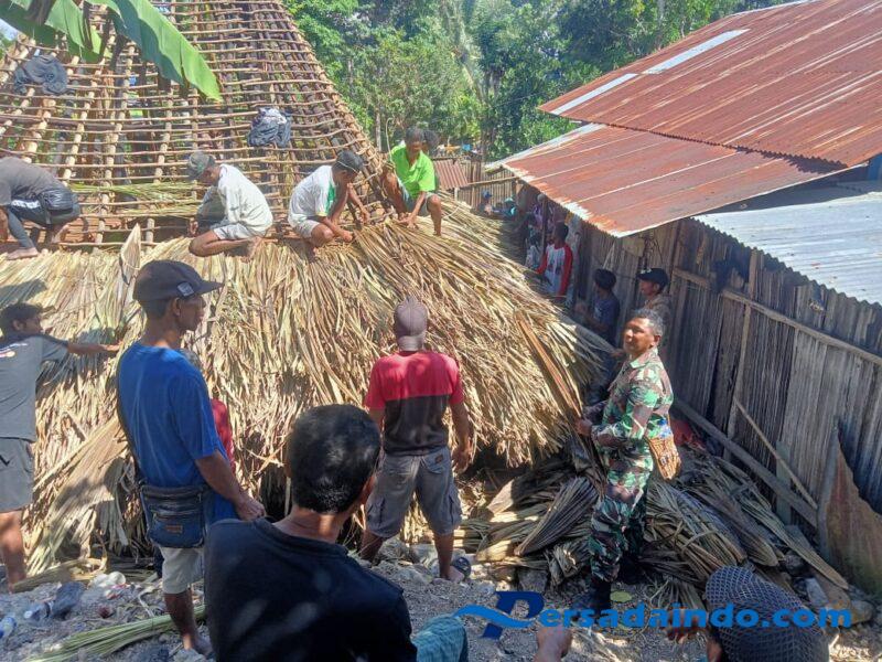 • Pupuk Budaya Gotong Royong, Satgaster Pos Halibete II Bantu Atap Rumah Adat