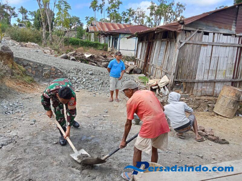 Melihat warganya bergotong royong mencampur adukan semen untuk pondasi rumah, Serda Mursal Suryadi Babinsa Koramil 1618-06/Bian, tanpa ragu turut serta memberikan bantuan. Dengan penuh kepedulian, ia ikut mencampur semen dan membantu proses pembangunan secara langsung.