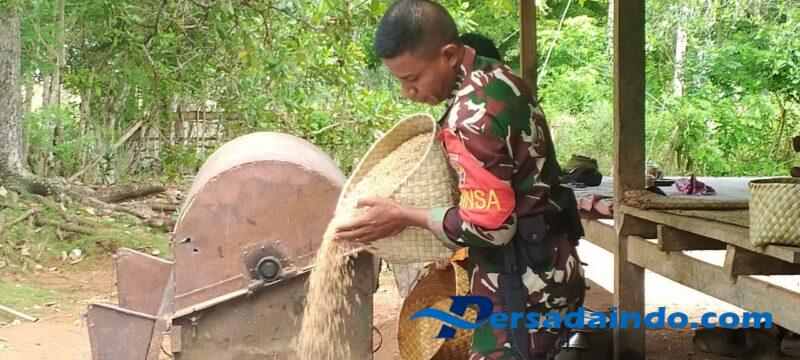 NTT- Sumba Timur, Dalam mendukung ketahanan pangan dan memperkuat semangat gotong royong di tengah masyarakat, Babinsa Koramil 03/Pahunga Lodu jajaran Kodim 1601/Sumba Timur, Pratu Anton Ndima turut membantu warga dalam kegiatan pembersihan gabah padi pasca panen di Desa Tamma, Kecamatan Pahunga Lodu, Kabupaten Sumba Timur, Minggu (29/06/2025)