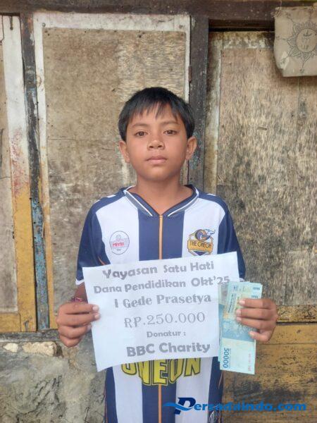 I Gede Prasetya, Kelas VIII SMP N 2 Batu Madeg dan Ni Kadek Dian Diana, Kelas V SD N 3 Klumpu ini adalah dua anak yang menjadi anak asuh Yayasan Satu Hati Bali, sehingga dalam setiap bulannya mereka akan menerima dana bantuan pendidikan.
