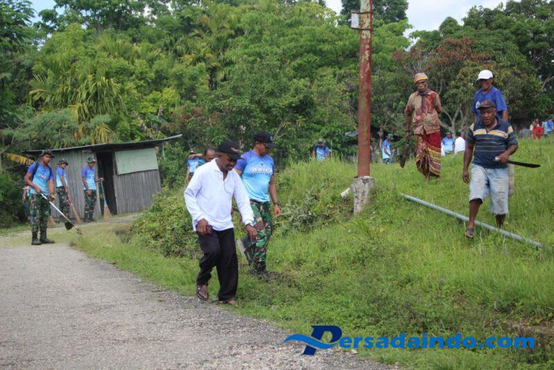 Personel Satgas Pamtas beserta seluruh elemen masyarakat bahu-membahu melaksanakan karya bakti pembersihan jalan desa. Fokus utama Karya Bakti ini adalah pemotongan rumput dan penertiban semak belukar yang tumbuh di kanan dan kiri bahu jalan. Kondisi jalan yang bersih dan terawat sangat vital untuk kelancaran mobilitas warga, terutama yang akan menuju Pasar Eban Lama.