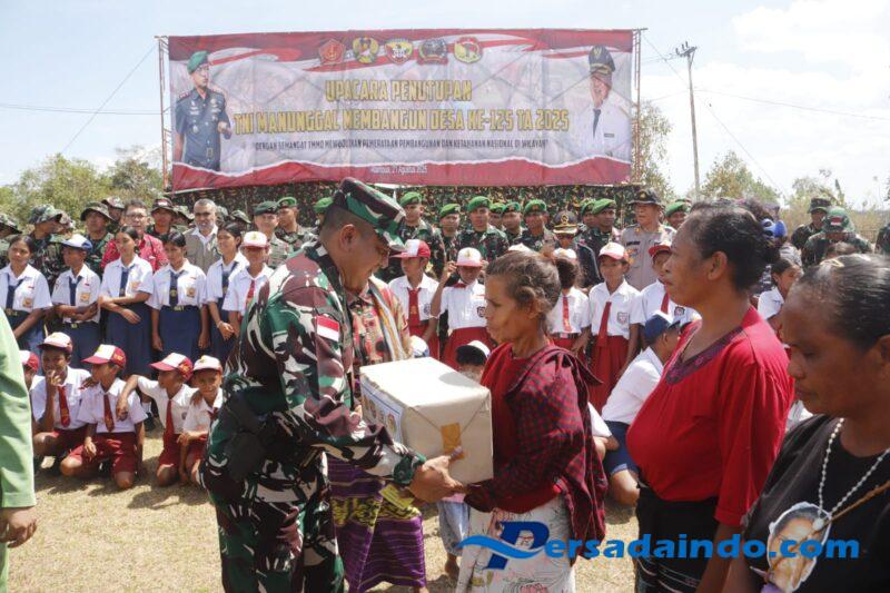 KODIM 1605/BELU, Satuan Tugas TNI Manunggal Membangun Desa (Satgas TMMD) 125 tahun 2025 Kodim 1605/Belu memberikan sejumlah bantuan paket sembako kepada warga masyarakat pada upacara penutupan TMMD 125 Kodim 1605/Belu yang berlangsung di Lapangan Desa Naekasa, Kecamatan Tasifeto Barat, Kabupaten Belu, Kamis (21/8/2025).
