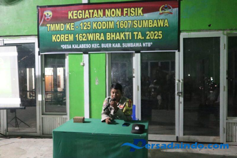 NTB – Sumbawa Besar, Dalam rangka mendukung terwujudnya keamanan dan ketertiban masyarakat, Satuan Tugas TNI Manunggal Membangun Desa (TMMD) ke-125 Kodim 1607/Sumbawa menggelar kegiatan penyuluhan tentang Keamanan dan Ketertiban Masyarakat (Kamtibmas) di Desa Kalabeso, Kecamatan Buer, Kamis (31/7/2025).