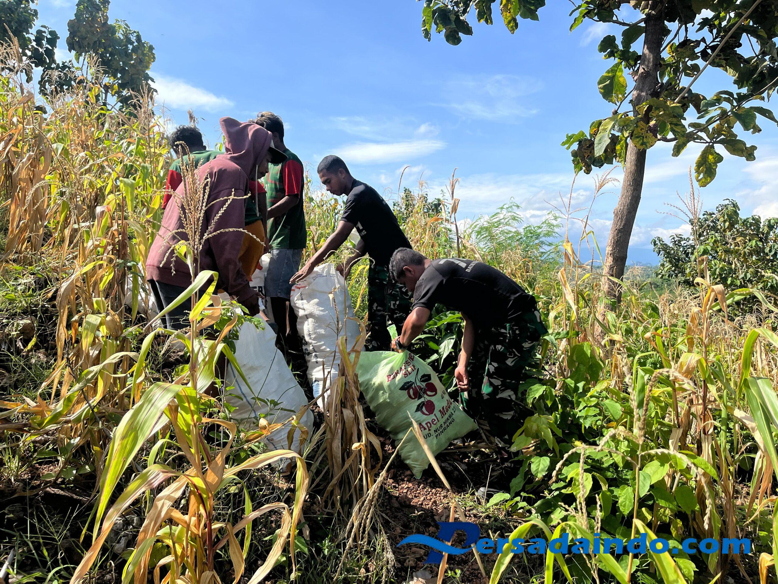Malaka – Pos Auren Satgas Pamtas RI-RDTL Yonif 741/Garuda Nusantara bersama masyarakat perbatasan melaksanakan panen jagung, bertempat di Dusun Raisikun, Kecamatan Kobalima Timur, Kabupaten Malaka. Minggu (30/03/2024).
