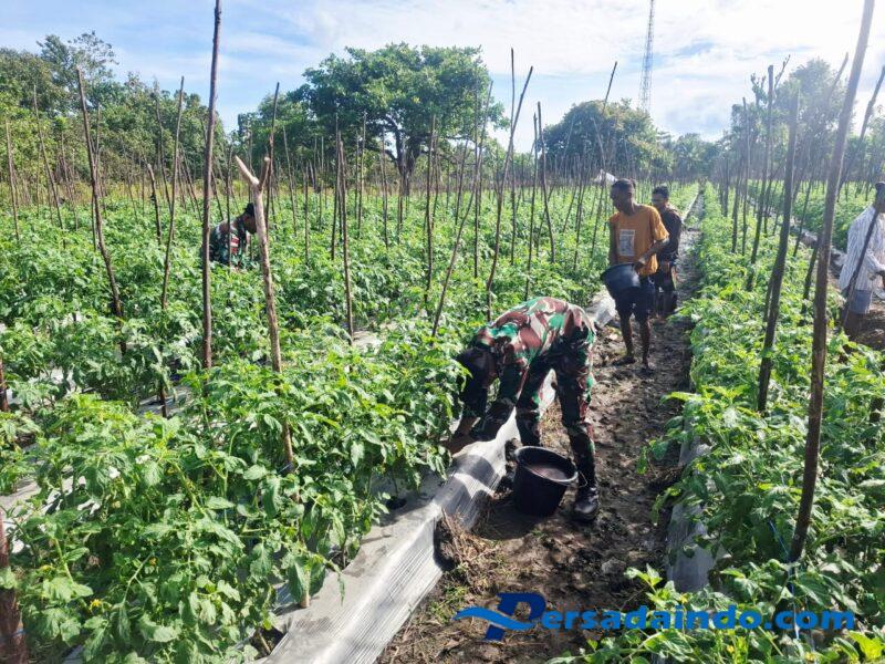 Belu – Dukung program pemerintah dalam ketahanan pangan Pos Fatubesi Atas membantu petani dalam proses pemupukan tanaman tomat di Dusun Loohali, Desa Takirin, Kecamatan Tasifeto Timur, Kabupaten Belu. Sabtu (14/06/2025).
