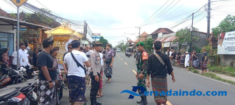 Klungkung,- Aparat gabungan yang terdiri dari Babinsa, Bhabinkamtibmas dan pecalang Banjar Selat, Desa Banjarangkan, Kecamatan Banjarangkan, Kabupaten Klungkung memberikan bantuan keamanan berlangsungnya upacara keagamaan pitra yadnya pengabenan di Banjar Selat, Selasa ( 15/07/25 ).