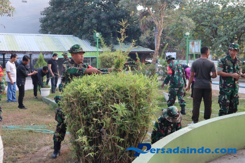 Personel TNI dari Kodim dan Yonif TP 835/SWB bersama masyarakat membersihkan taman, memangkas rumput, dan memperindah kawasan sekitar Makodim agar terlihat asri dan tertata rapi.