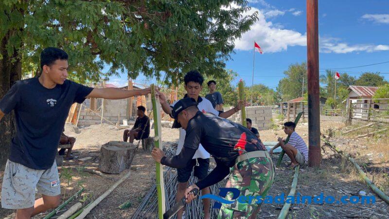 Belu – Satgas Pos Salore bersama warga perbatasan membuat gapura merah putih di Kampung Salore, Desa Tulakadi, Kecamatan Tasifeto. Jumat (08/08/2025).