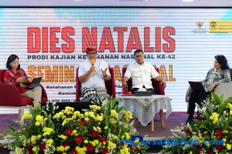 Tabanan PR – Hadir sebagai narasumber dalam Seminar Nasional Ketahanan Pangan Sebagai Pilar Pengentasan Kemiskinan Berbasis Kearifan Lokal, Bupati Tabanan, Dr. I Komang Gede Sanjaya, S.E., M.M., menegaskan pentingnya penguatan kearifan lokal sebagai fondasi ketahanan pangan nasional. Seminar yang berlangsung pada Jumat, (21/11), di Gedung IASTH UI, Kampus Universitas Indonesia Salemba, Jakarta Pusat ini merupakan rangkaian Dies Natalis ke-42 Program Studi Kajian Ketahanan Nasional, Departemen Kajian Stratejik Ketahanan dan Keamanan, Sekolah Pascasarjana Pembangunan Berkelanjutan Universitas Indonesia, bekerja sama dengan BP Taskin RI.