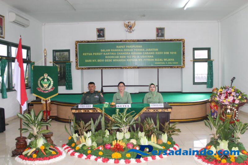 Gianyar – Makodim, Kamis (3/7/2025) Bertempat di Gedung Manunggal TNI Rakyat Kodim 1616/Gianyar, telah berlangsung kegiatan Rapat Paripurna dalam rangka Serah Terima Jabatan Ketua Persit Kartika Chandra Kirana Cabang XXXV Dim 1616 Koorcab Rem 163 PD IX/Udayana dari Ny. Devi Gede Winarsa kepada Ny. Fitroh Rizal Wijaya. Kegiatan ini dihadiri oleh sekitar 30 orang anggota Persit Kartika Chandra Kirana Cabang XXXV Dim 1616.