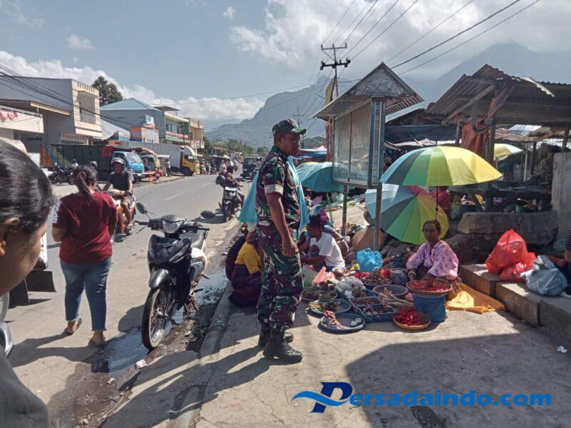 Dalam kegiatan tersebut, Babinsa memantau langsung situasi dan perkembangan di pasar untuk menjaga keamanan dan ketertiban selama aktivitas jual beli berlangsung. Serda Damianus juga menghimbau masyarakat yang beraktivitas di pasar agar selalu menjaga kondisi Kamtibmas agar tercipta suasana yang aman dan kondusif.