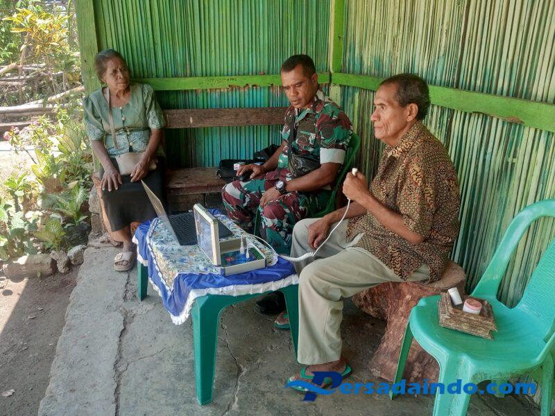 KODIM 1605/BELU, Dalam membantu masyarakat untuk mengetahui kesehatan mereka, Serda Hironimus Kono anggota Satgaster Kodim 1605/Belu Pos Halibete II memberikan pelayanan pemeriksaan kesehatan secara gratis kepada warga masyarakat di Dusun Lahurus, Desa Fatulotu, Kecamatan Lasiolat, Kabupaten Belu, Selasa (28/10/2025).