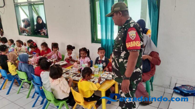 Ende — Babinsa Koramil 1602-01/Ende, Serda Ridwan Ali, bersama staf pengajar TK KARTIKA VII-8, melaksanakan kegiatan pembagian makanan bergizi gratis kepada 83 siswa dan siswi di Kelurahan Kotaraja, Kecamatan Ende Utara, Kabupaten Ende.