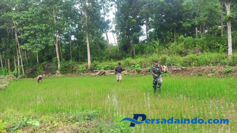 SUMBA BARAT – Dalam rangka mendukung program ketahanan pangan dan meningkatkan hasil pertanian warga, anggota Koramil 1613-01/Loli, Serka Frengki Moni yang menjabat sebagai Babinsa Kelurahan Diratana, Kecamatan Loli, Kabupaten Sumba Barat, melaksanakan pendampingan kepada para petani yang sedang melakukan pemupukan tanaman padi di area persawahan, Minggu (13/7/2025).