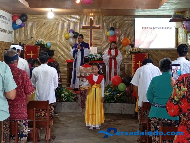 Ibadah yang dimulai pukul 09.00 WITA hingga pukul 10.30 WITA ini mengusung tema “Menjadi Gereja Pembawa Damai”, dipimpin oleh Bishop Si Bagus Herman Suryadi, M.Th., dan Pendeta Karenda Yucha, S.Si.Teol.