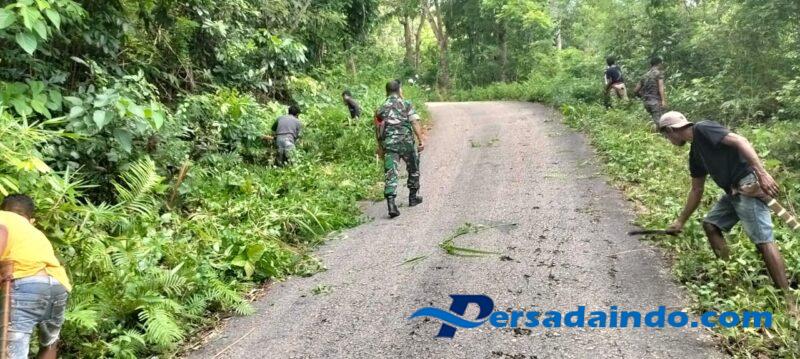 SUMBA BARAT – Babinsa Koramil 02/Walakaka, Kodim 1613/Sumba Barat, Serka Ramli bersama warga melaksanakan kegiatan gotong royong pembersihan jalan dari semak belukar yang menghalangi pandangan para pengguna jalan di Desa Bodohula, Kecamatan Lamboya, Kabupaten Sumba Barat, Jumat (28/11/2025).