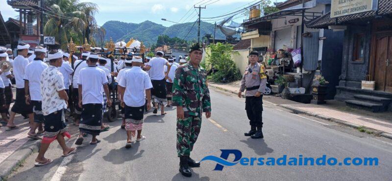 Dalam kesempatan tersebut, Babinsa Serma I Ketut Galung Astika bersama aparat keamanan lainnya terus memberikan imbauan kepada krama Desa Sengkidu agar senantiasa menjaga ketertiban dan keselamatan selama perjalanan prosesi, baik saat berangkat menuju Pantai Sengkidu maupun saat kembali ke Pura Puseh setelah upacara selesai.