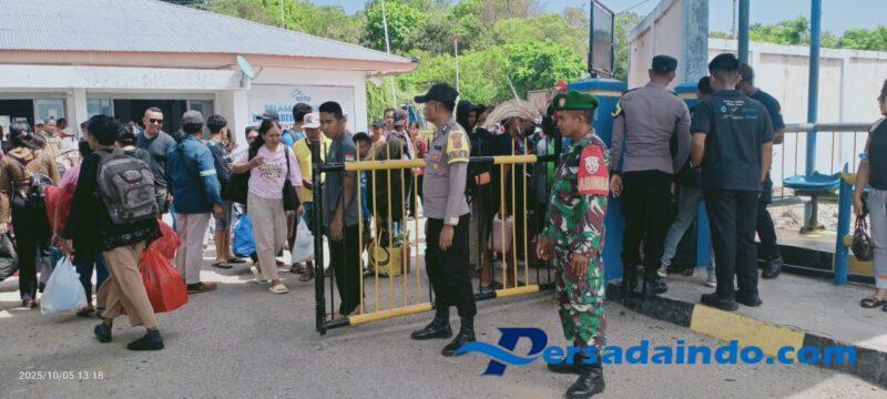 Selama kegiatan berlangsung, personel melakukan pemantauan situasi di sekitar pelabuhan, memastikan proses bongkar muat serta naik turunnya penumpang berjalan tertib dan aman.