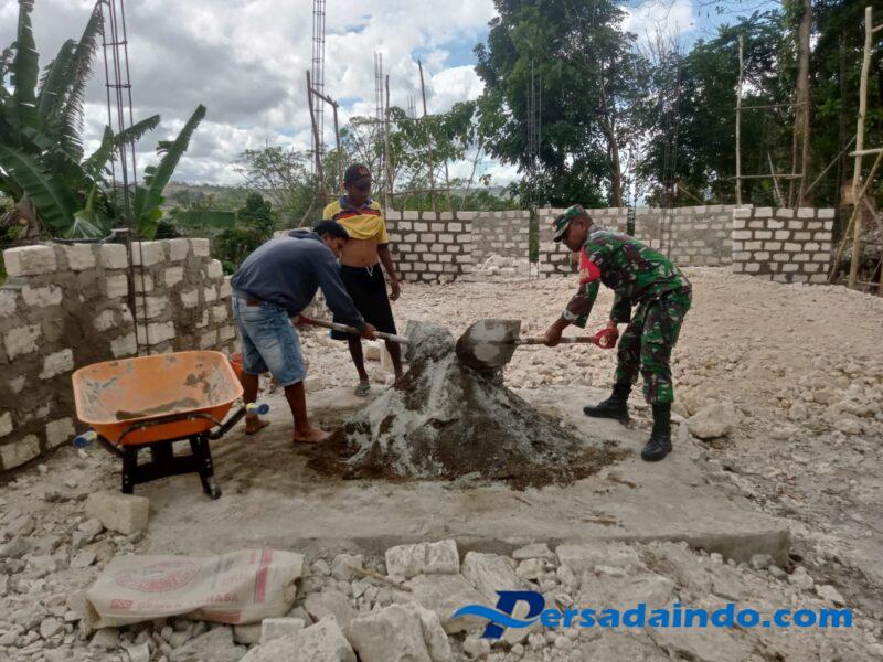 SUMBA BARAT — Babinsa Koramil 1613/Sumba Barat, Sertu Idhar, melaksanakan komunikasi sosial (Komsos) dengan warga desa binaan yang sedang melaksanakan pembangunan rumah di Desa Ole Ate, Kecamatan Mamboro, Kabupaten Sumba Barat, Kamis (11/9/2025).