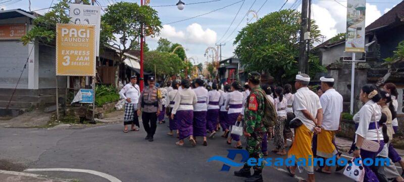 Gianyar – Beng, Minggu (7/12/2025) Dalam rangka menjaga ketertiban dan keamanan jalannya tradisi keagamaan di wilayah binaan, Babinsa Kelurahan Gianyar Koramil 1616-01/Gianyar, Sertu I Made Merta Yasa, bersama Bhabinkamtibmas I Gusti Ngurah Gede dan Pecalang Adat Gianyar melaksanakan pengamanan serta mengawal kegiatan warga yang mengikuti tradisi Upacara Kebeji Kerta Lampo – Mendak Tirta Anyar, sebagai bagian dari rangkaian upacara Piodalan di Pura Dalem Beng Gianyar.