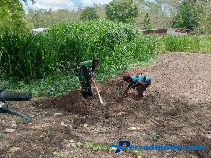 KODIM 1605/BELU, Dalam rangka menyiapkan ketahanan pangan wilayah, Anggota Satgaster Kodim 1605/Belu Pos Halibete II Serda Hironimus Kono mendampingi petani menyiapkan lahan pertanian milik Bapak Bapak Yohanes Atok warga Dusun Halibete, Desa Maneikun, Kecamatan Lasiolat, Kabupaten Belu, Rabu (6/11/2025).