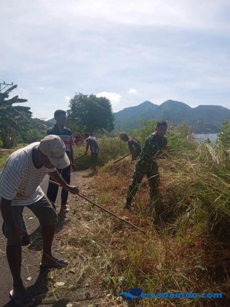 Solor Selatan, Flotim – Sebagai wujud kepedulian terhadap lingkungan dan upaya mempererat kemanunggalan TNI dengan rakyat, Babinsa Koramil 1624-05/Solor, Sertu Edison dan Praka Kadek Putra, melaksanakan kegiatan gotong royong pembersihan jalan bersama warga Desa Lemanu, Kecamatan Solor Selatan, Kabupaten Flores Timur, pada Jumat pagi (25/07/2025).