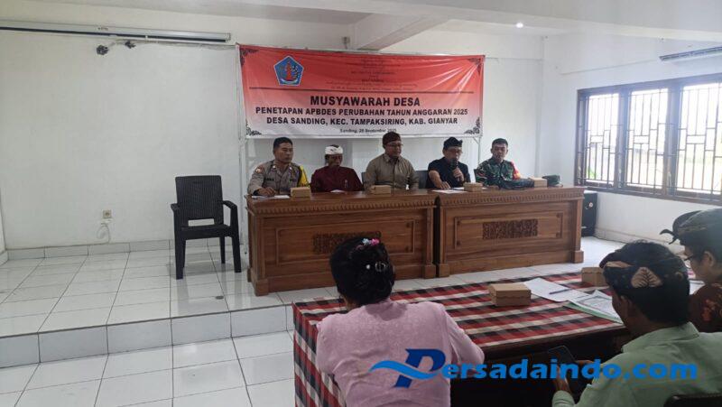 Bertempat di Ruang Rapat Desa Sanding, Kecamatan Tampaksiring, berlangsung kegiatan rapat pembahasan sekaligus penetapan Perubahan Anggaran Pendapatan dan Belanja Desa (APBDes) Tahun Anggaran 2025. Suasana rapat tampak berjalan dengan tertib, penuh keseriusan, dan diwarnai semangat kebersamaan dari seluruh unsur yang hadir.